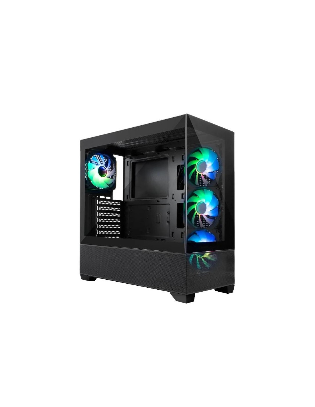 Caja para PC Gaming con cristal templado panorámico frontal y lateral. Incluye 4 ventiladores ARGB Infinity de 12 cm (1 trasero + 3 en el lateral) y es compatible con kits de refrigeración líquida de 120 mm (en la parte posterior) o 240mm/360mm (en la parte superior).