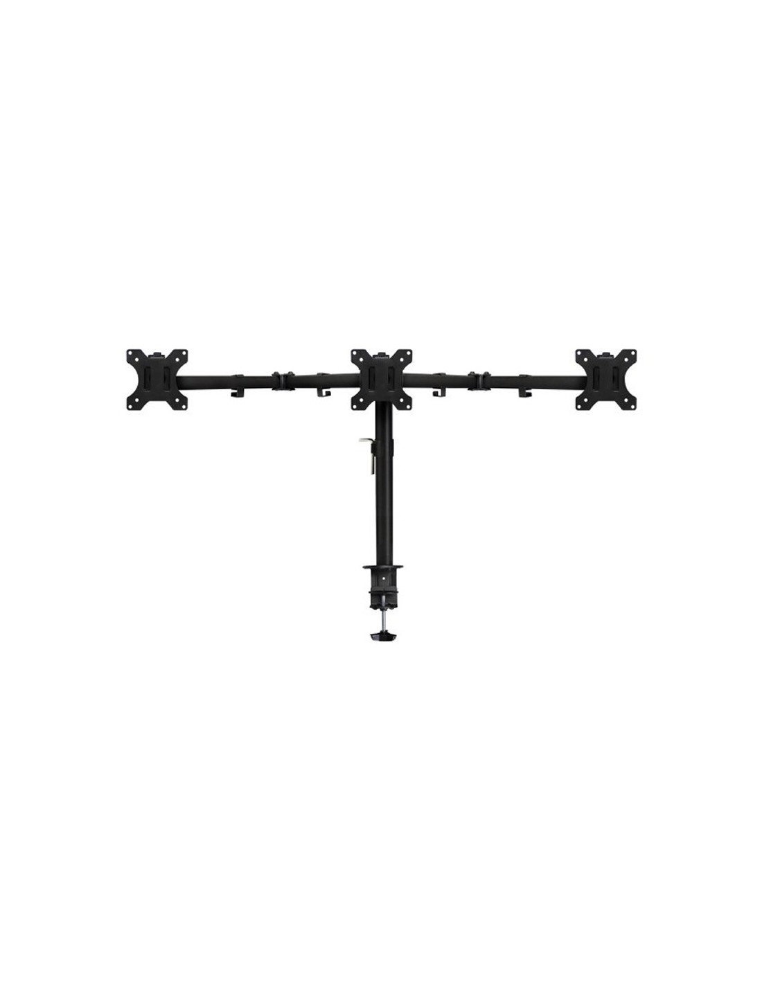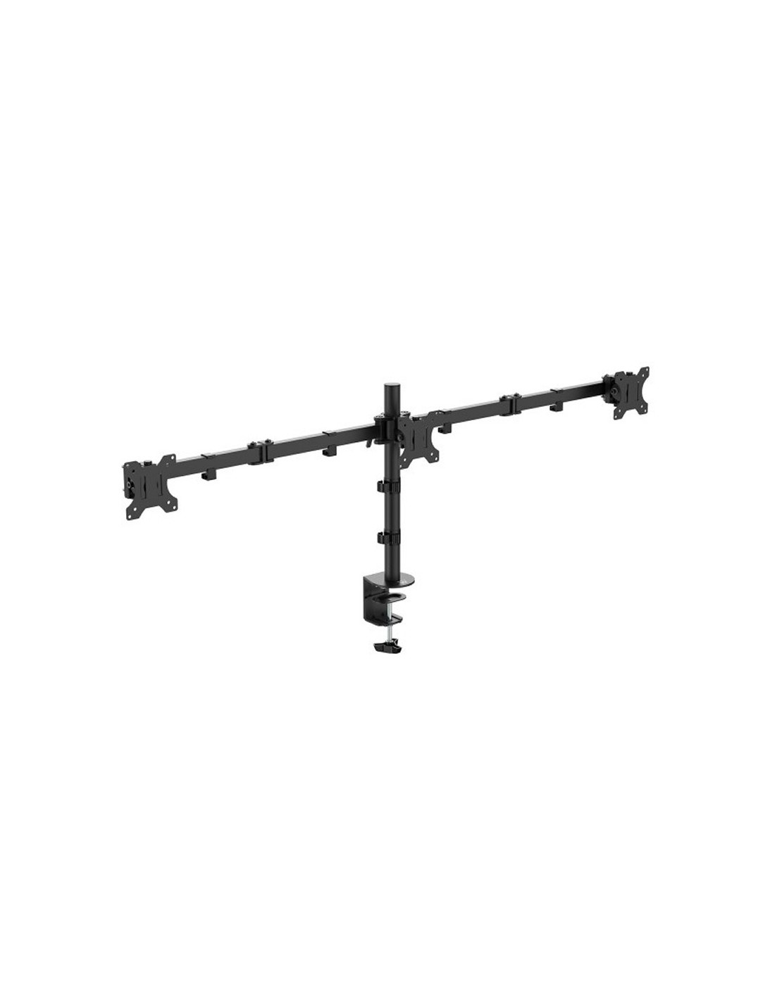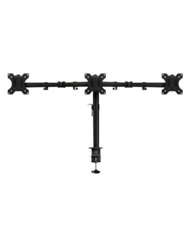 | Características | - Material: aluminio, acero, plástico - Acabado de la superficie: recubrimiento en polvo - De color negro - Dimensiones: An x Alt x Prof: 1430 x 548 x 148mm - Instalación: Abrazadera, montaje en escritorio - Tamaño de pantalla sugerido: 13" - 27" - Adecuado para: 3 pantallas - Rango de capacidad de peso: 0-7 kg - Carga nominal: 7 kg por pantalla - VESA: 100 x 100, 75 x 75 - Puntos de pivote: 3 - Inclinación: + 90° -90° - Giratorio: 360° - Girar: 360° - Brazo Extendido: 658mm - Altura: 443mm - Grosor de la abrazadera: 10mm-88mm - Altura libremente ajustable - Alineación de pantalla individual - Gestión de cables |