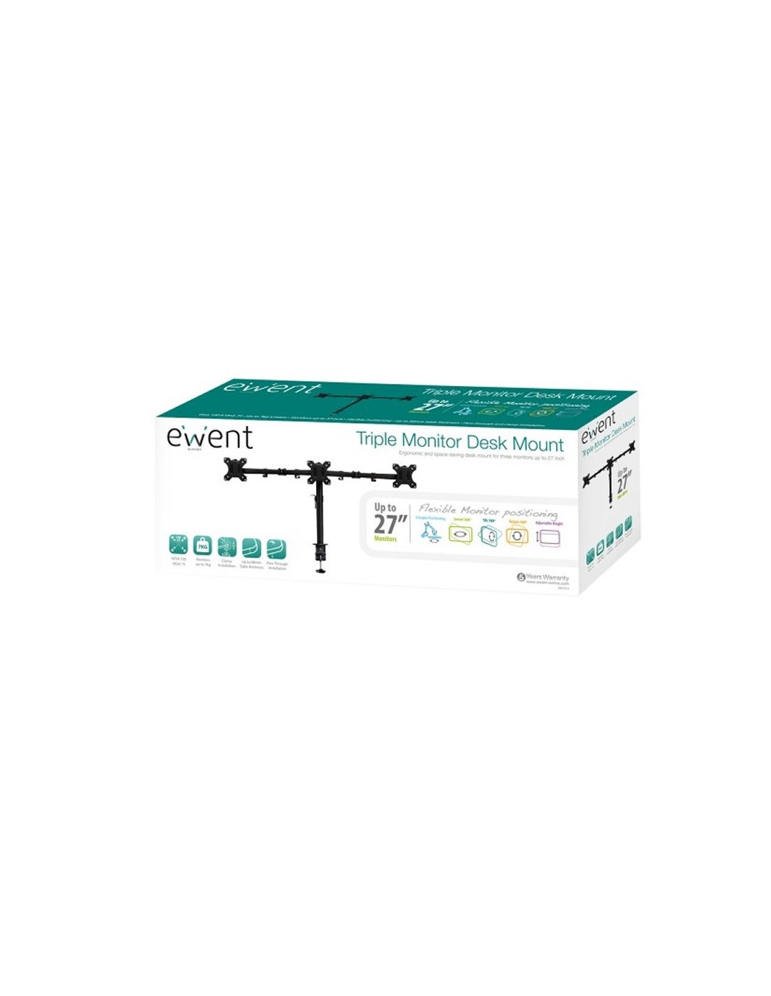 Cree un entorno de trabajo ergonómico y que ahorre espacio utilizando el Soporte de escritorio EW1513 para tres monitores, totalmente metálico. Coloque tres monitores a la altura y con el ángulo de visualización ideales para conseguir una postura mejor y, de esta manera, evitar dolencias de espalda, cuello y hombros. El soporte de escritorio triple EW1513 es adecuado para monitores de hasta 27 pulgadas y 7 Kg y es fácil de acoplar al escritorio a través de un abrazadera o soporte con ranura.