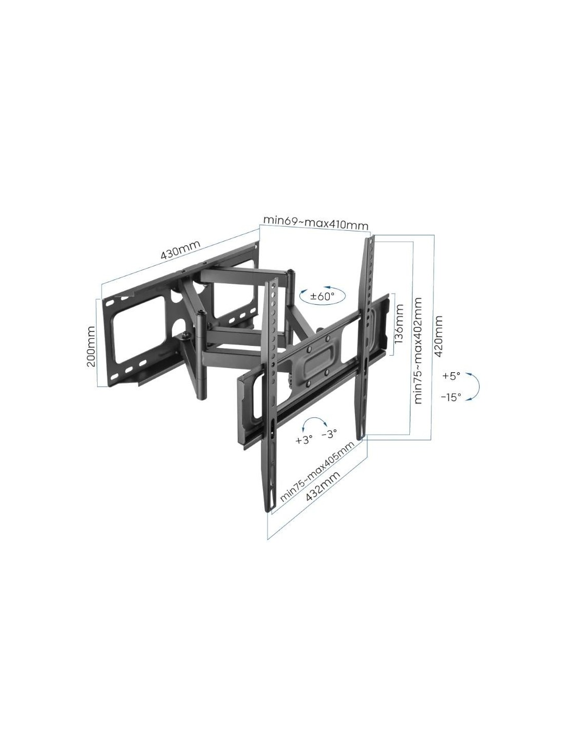 | Características | - Monitor soportado: 32"-70" - VESA: 75x75, 100x100, 100x150, 150x100, 150x150, 150x200, 200x200, 300x200, 300x300, 400x200, 400x300, 400x400 - Peso máximo soportado: 45 kg - Ángulos: Inclinación: +5°/-15° Giro: +3°/-3° Rotación: +60°/-60° - Distancia a pared: 69 - 410 mm - Color: negro - Peso bruto: 5,10 kg - Medidas (embalaje): 208 x 438 x 68 mm - Incluye manual, tornillería e instrucciones de instalación - Cumple especificaciones RoHS |