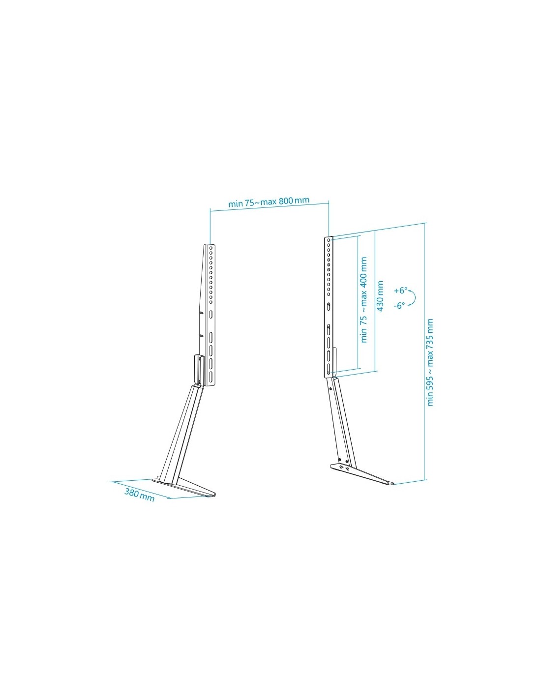 | Características | - Pantallas soportadas: 32" - 70" - Compatible con VESA: 75x75, 100x100, 100x150, 100x200, 150x100, 150x150, 200x100, 200x200, 300x200, 300x300, 400x200, 400x300, 400x400, 600x400 y 800x400 - Peso máximo soportado de pantalla: 50 kg - Ángulo de inclinación: +6°/0°/-6° - Rango de ajuste para la altura del soporte: 595-666-735 mm - Altura máxima del soporte: 735 mm - Medidas de la peana: 835 x 380 mm - Sistema de organización de cables - Incluye almohadillas de silicona - Compatible con pantallas curvas - Material: Acero - Color: Negro - Peso neto: 2,86 kg. Peso bruto: 3,02 kg. - Medidas del embalaje: 445 x 140 x 45 mm Contenido - 1 x Soporte - 1 x Kit montaje (incluye herramienta) - 1 x Manual de instalación |