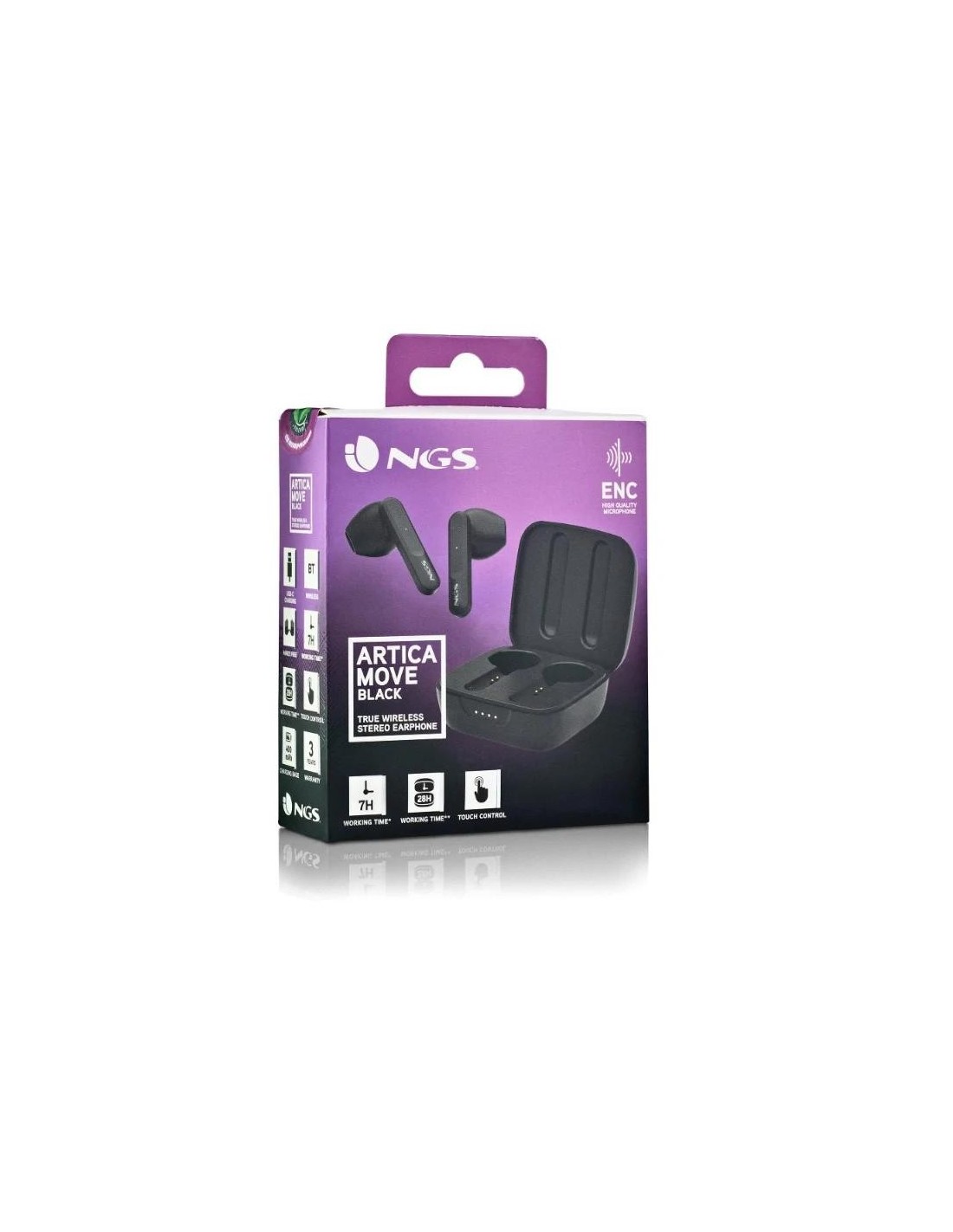 | Características | - Versión de Bluetooth: 5.3 - Chipset: JL6983 - Batería de los auriculares: 35mAh - Batería de la base: 400mAh - Potencia nominal: 3mW - Respuesta de frecuencia: 20-20kHz - Relación señal/ruido: >101dB - Rango de frecuencia: 2402MHz~2480MHz - Base de carga: 400mAh / 3,7 V - Carga los auriculares 3 veces - Tiempo de carga de la base: 3 horas - Distancia de trabajo: hasta 10m Dimensiones - Auricular: 17 x 16 x 37 mm - Base: 52 x 47 x 21 mm Contenido - ARTICA MOVE - Base de carga - Cable de carga tipo-C - Guía de instalación |