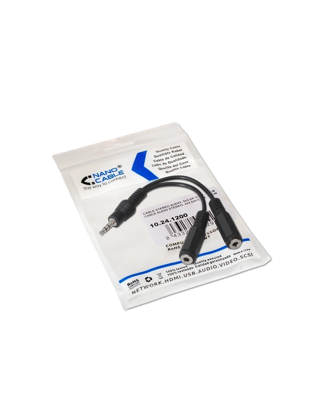 Cable audio con conector tipo Jack 3.5” macho en un extremo y 2 X Jack 3.5” hembra en otro