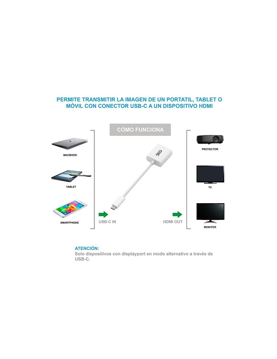 | Caracteristicas | - El puerto HDMI soporta la resolución máxima 4k x 2k / 30HZ - Soporta HDCP - Compatible con Macbook Pro, Macbook con puerto Thunderbolt 3, Google Chromebook. - No requiere software ni controladores, una solución totalmente plug and play - Longitud: 15 cm - Color: blanco - Normativas: RoHS - Test de Funcionamiento: 100% testado Contenido del paquete: - 1 x Conversor USB-C a HDMI 4K, 15 cm |
