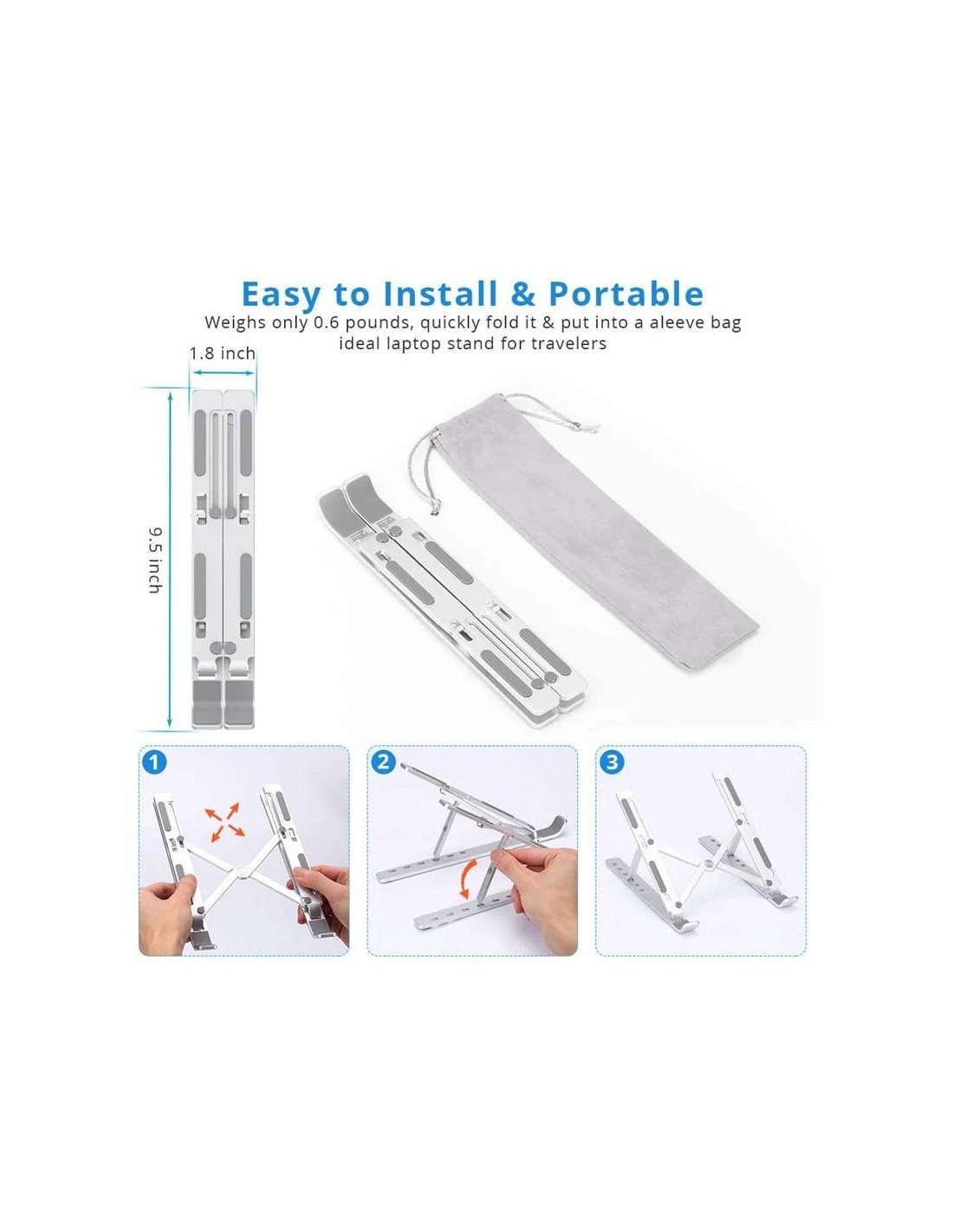 | Características | - Material: aleación de aluminio y silicona - Dimensiones D x W x H: 250 x 180 x 150 mm cuando se abre; 45 x 254 x 15 mm cuando está plegado - Altura ajustable: 55-150 mm - Peso: 255 gramos - Posiciones de altura: 6 - Color: Plata |