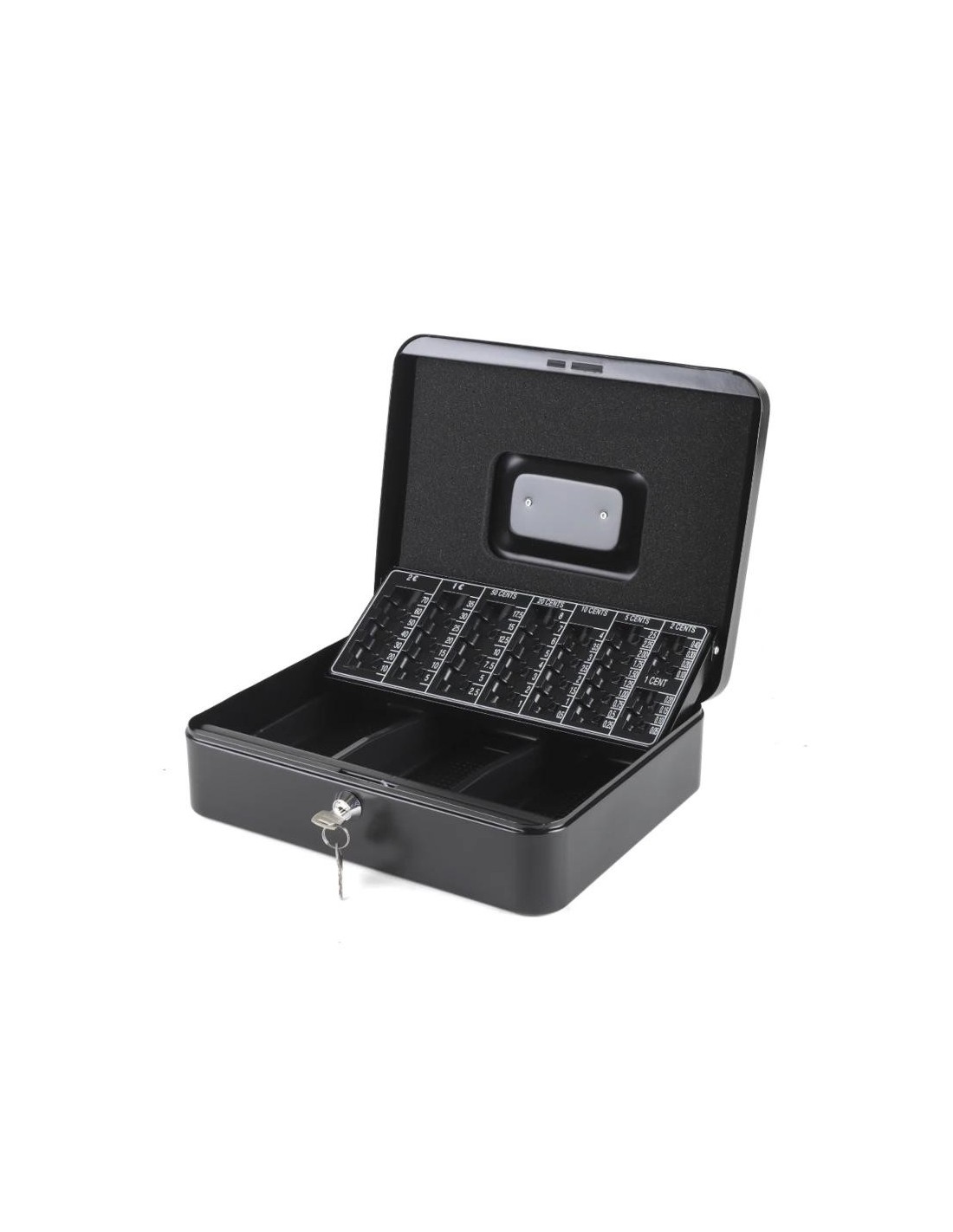| Características | - Caja de efectivo para monedas y billetes - Asa superior - Cerradura frontal de dos posiciones (abierto o cerrado) - Apertura manual con llave (incluye juego de 2 llaves) - Compartimentos: 3 billetes y 8 monedas - Bandeja extraíble con separadores para 8 tamaños de monedas: 2€ - hasta 70€ (35 monedas) 1€ - hasta 35€ (35 monedas) 50 céntimos - hasta 17,50€ (35 monedas) 20 céntimos - hasta 8€ (40 monedas) 10 céntimos - hasta 4€ (40 monedas) 5 céntimos - hasta 2,50€ (50 monedas) 2 céntimos - hasta 40 céntimos (20 monedas) 1 céntimo - hasta 20 céntimos (20 monedas) - Bandeja extraíble para 3 billetes (17 alto x 8,5 ancho cm) - Medidas: 300 ancho x 240 profundo x 90 alto mm - Material: caja de acero, bandeja para billetes de ABS y compartimento para billetes de PVC - Peso: 1,77 kg - Color: negro |