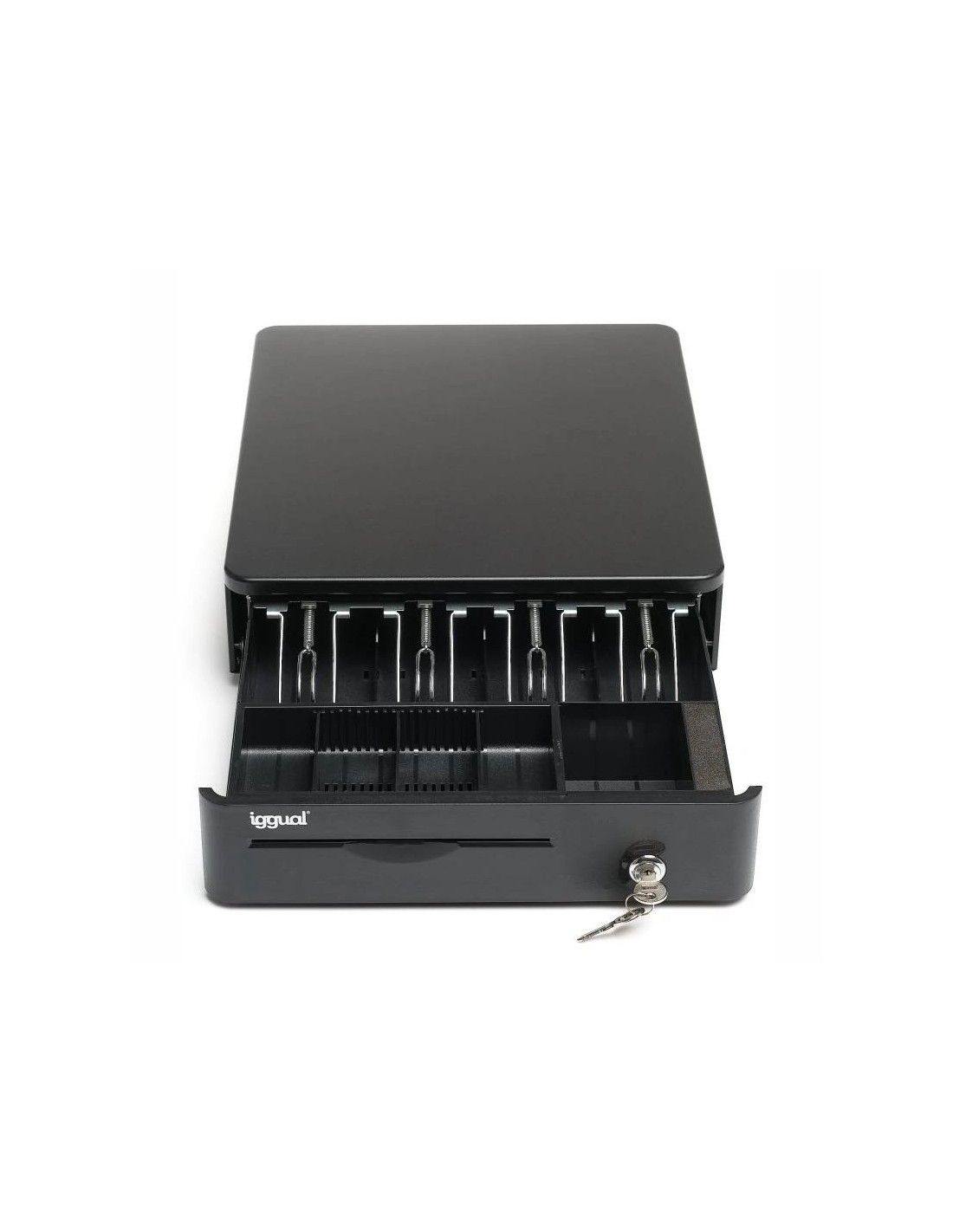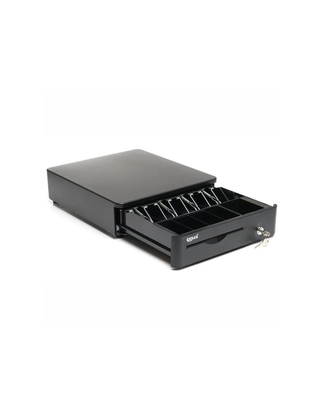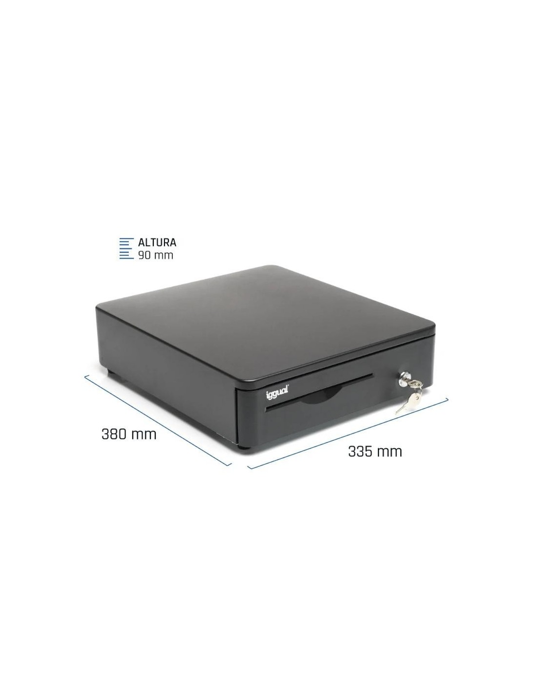 | Características | - Ranura de acceso frontal - Rodillos de cojinete de bolas de alta resistencia - Cerradura tres posiciones de bloqueo - Apertura manual o automática - Compartimentos: 4 billetes y 5 monedas (1 fijo + 4 ajustables) - Interfaz RJ11 (alimentación 12V) - Incluye cable RJ11 de 1 metro de longitud - Dimensiones: 380 x 335 x 90 mm - Peso: 3,6 kg - Humidificador de yemas - Bordes redondeados - Color: negro - 1 ranura para cheque, recibo, etc. - Célula de agua - Juego de 2 llaves |