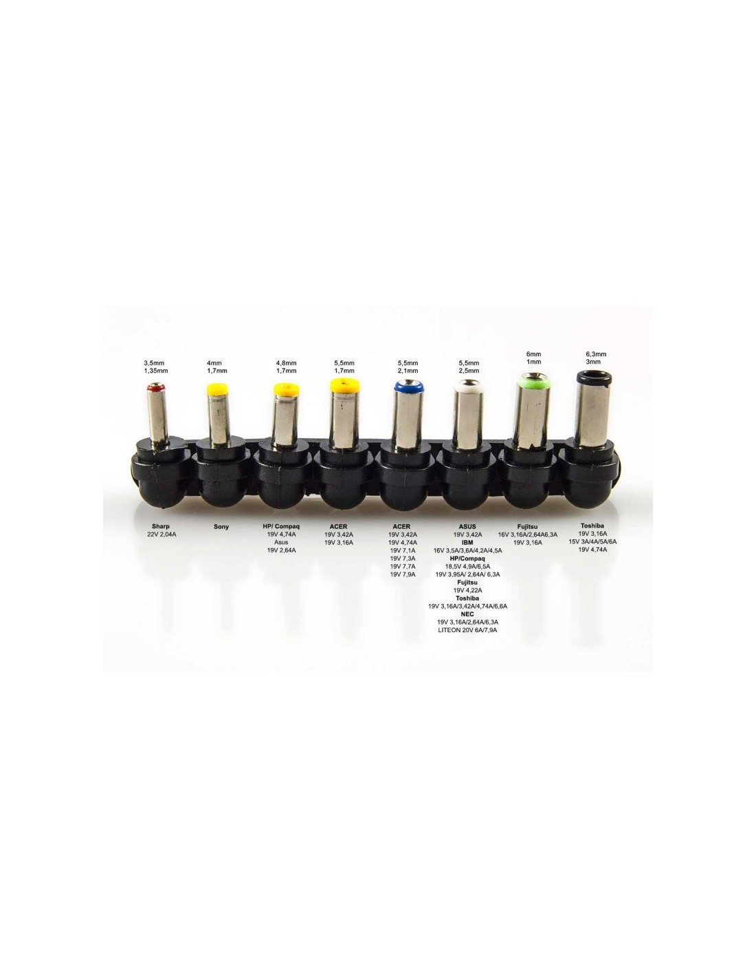 | Otras características | - Incluye 8 puntas IBM, SONY, TOSHIBA, HP/COMPAQ, DELL, ACER, FUJITSU, SHARP, LENOVO - Puerto USB adicional de 5V para cargar su teléfono móvil, tableta o reproductor MP3 - Voltajes Salida: 12V/ 15V/ 16V/ 18V/ 19V/ 20V/ 22V/ 24V - Voltajes de Entrada: AC 100-240V - Material: Aluminio - Dimensiones: 113 x 64 x 25 mm |