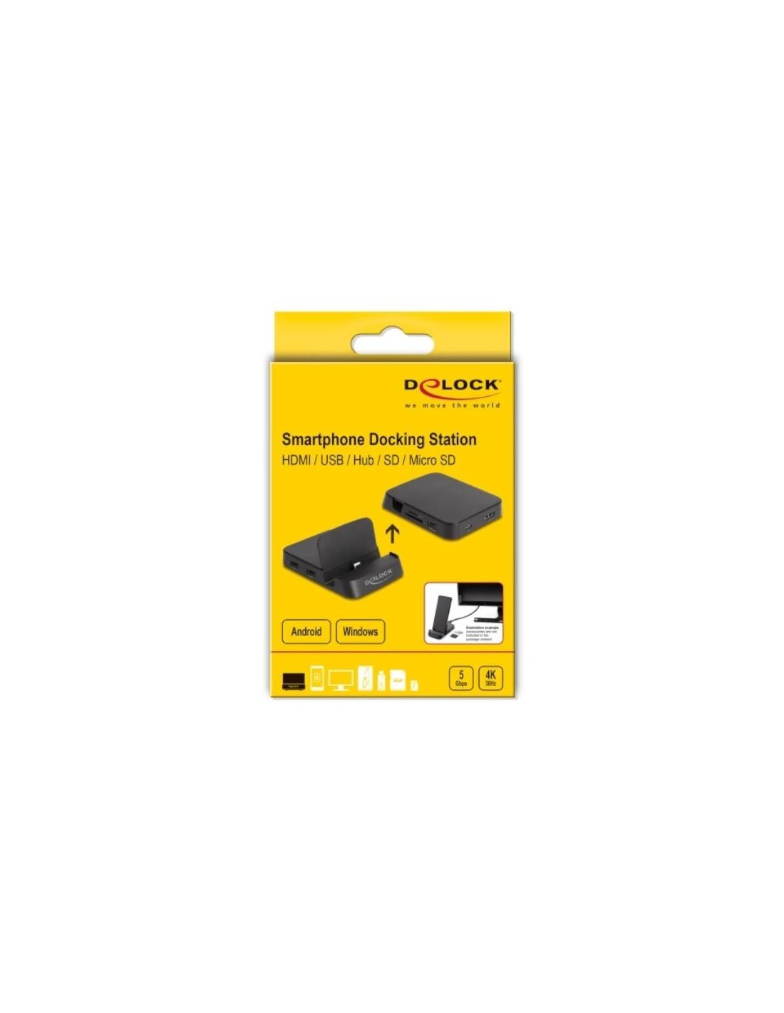 Esta estación de acoplamiento para smartphone de Delock es el complemento ideal para su escritorio o cuando viaja y convierte un smartphone en un completo sistema de escritorio. Además de 3 puertos USB Tipo-A aptos para plug & play, también ofrece una interfaz HDMI, así como una ranura SD y Micro SD para tarjetas de memoria. En la salida HDMI se puede utilizar un monitor con una resolución máxima de hasta 4K 30 Hz.