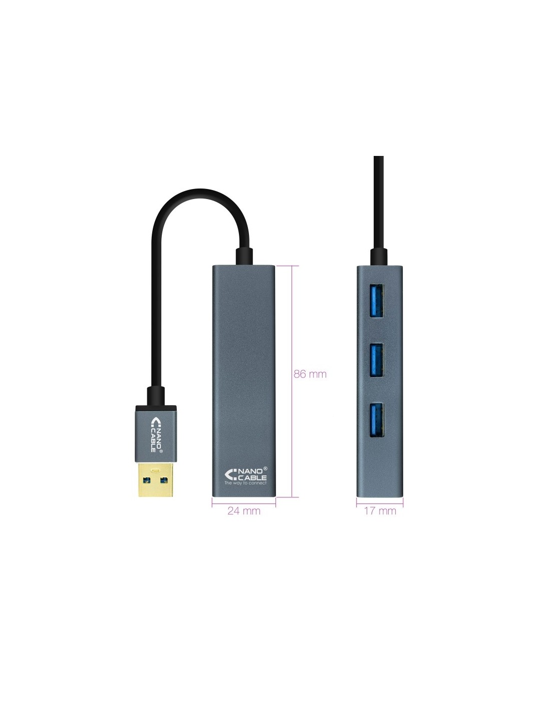 Hub USB 3.0 con 4 puertos USB 3.0, con conector USB 3.0 Tipo A macho en un extremo y 4 puertos USB 3.0 Tipo A hembra en el otro.