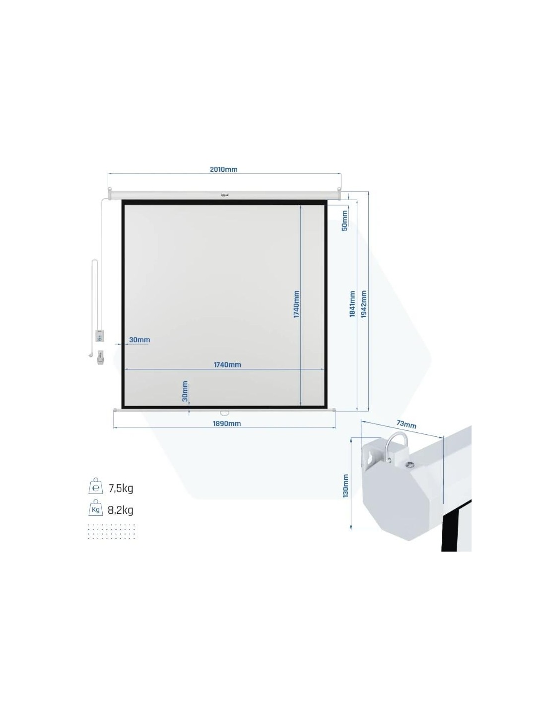| Otras características | - Color: blanco y negro Dimensiones y peso - Medidas panel: 1800 x 1800 mm - Medidas cajetín (cm): 201 (largo) x 13 (alto) x 7,3 (profundo) - Medida barra inferior: 189 cm - Peso bruto: 8,2 kg - Peso neto: 7,5 kg Contenido - Pantalla para proyección 180 x 180 cm - Control de pared - Mando remoto infrarrojo (IR) - Hoja de instrucciones |