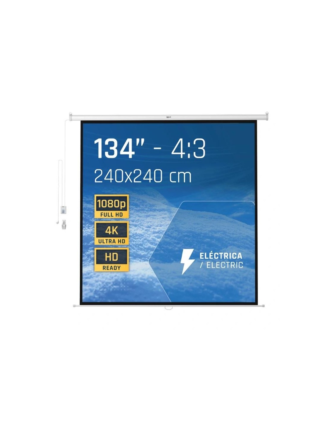 Presentaciones grandes merecen una pantalla a la altura. La PSIES240 de iggual ofrece un área de proyección de 240x240 cm que destaca por su superficie de 4 capas, pensada para lograr una imagen más nítida, con mejor contraste y colores más vivos. Su accionamiento eléctrico, con mando a distancia y control mural, permite subir y bajar la pantalla con total comodidad. Además, su instalación en techo o pared se adapta sin problemas a distintos espacios. La compatibilidad con una gran variedad de proyectores la convierte en una opción versátil para diferentes entornos.