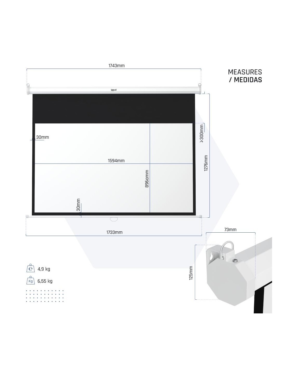 | Medidas | - Área de visualización: 159 x 89 cm - Cajetín: 174 x 7,3 x 12,5 cm |
