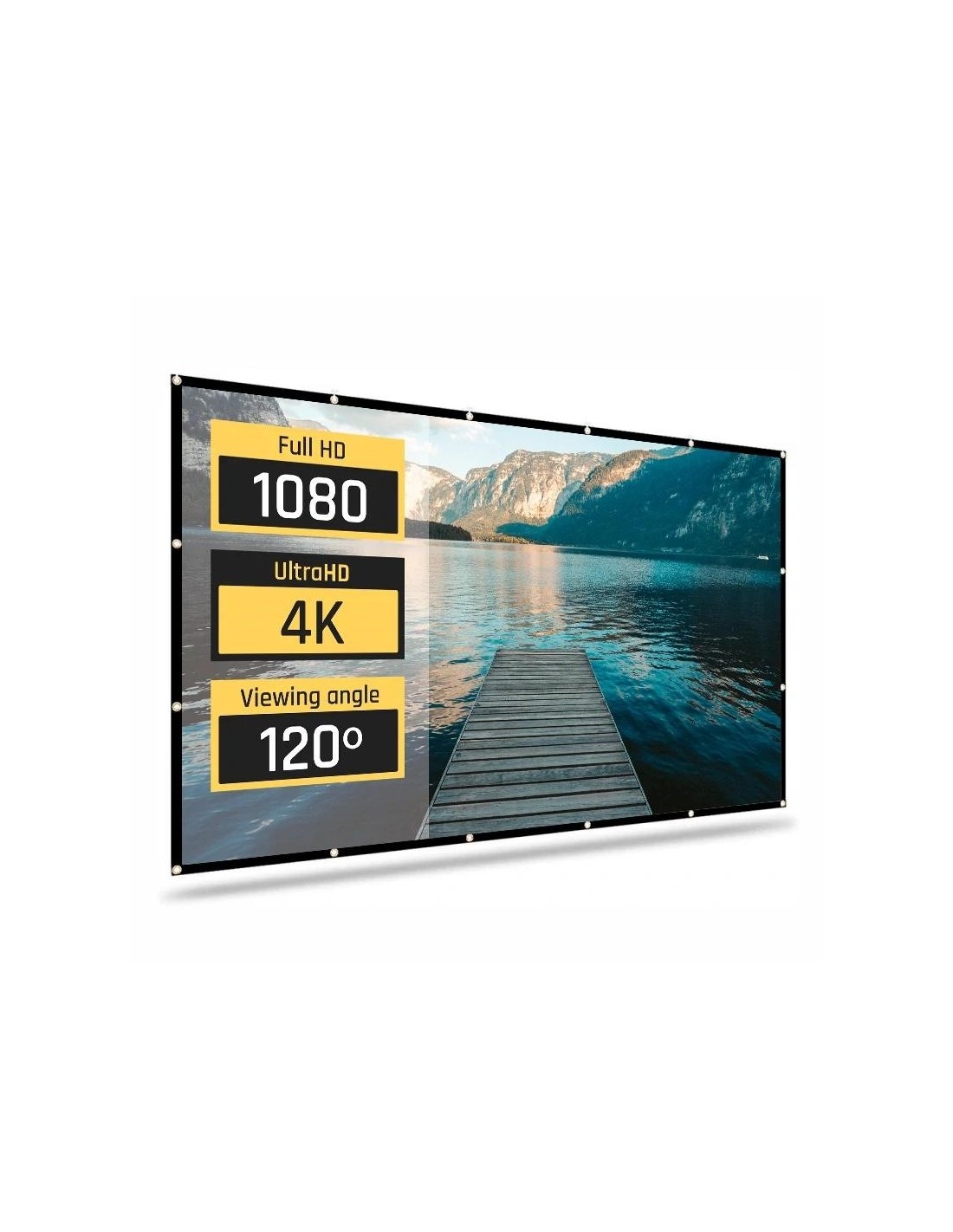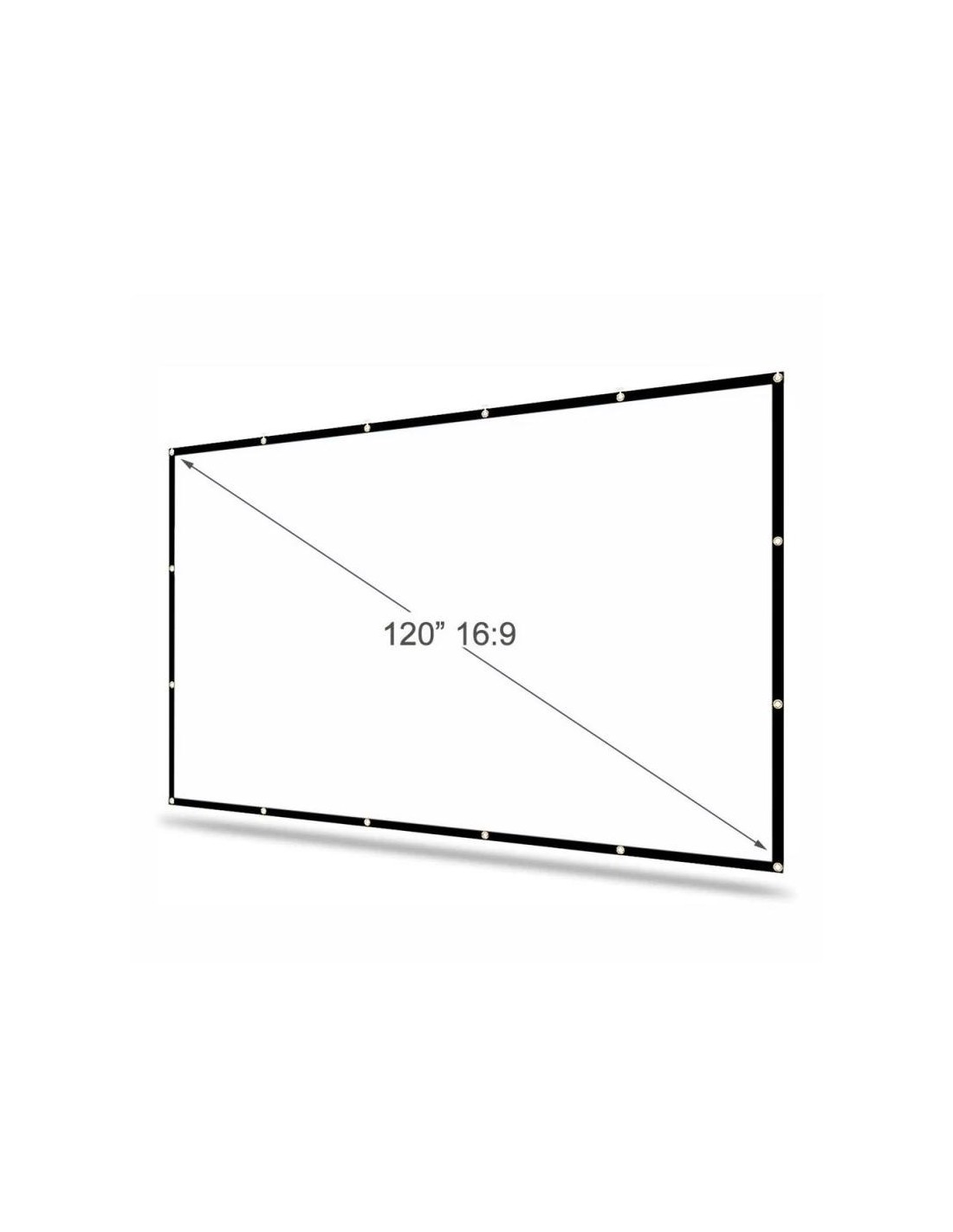 | Características | - Área visible de 120" (265 x 149 cm) - Formato: panorámico 16:9 - 16 ollaos - Factor de ganancia: 1,1 - Ángulo de visión: 120º - Ideal para proyectar vídeo y fotografías - Bordes negros perimetrales de 3 cm - Apta para interiores - Tela elástica de poliéster resistente a las arrugas, plegable y lavable - Ideal para cualquier tipo de proyector, SVGA, XGA, 3D, HD, Full HD y 4K - Temperatura de trabajo: -20ºC ~ +60ºC - Medida plegada en bolsa: 36 x 29 x 5 cm - Peso total: 900 g - Incluye 4 cuerdas de 1 metro de longitud y set de 19 colgadores |