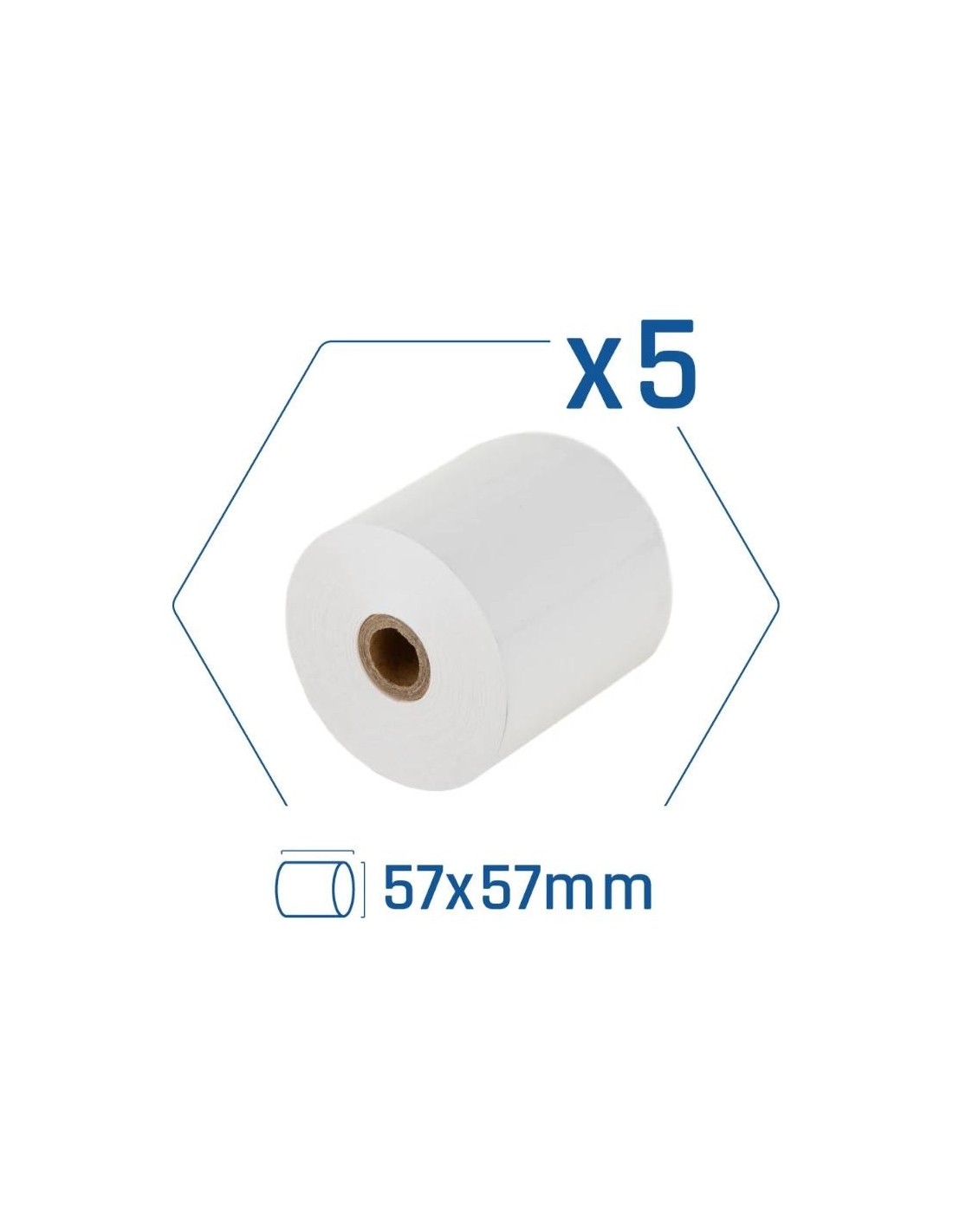 | Características | - Pack de 5 unidades - Rollo de papel térmico 57 x 57 x 13 mm - Ancho papel: 57 mm - Diámetro exterior rollo: 57 mm - Diámetro agujero interior: 13 mm - Gramaje: 65 g / m2 - No contiene BPA (Bisfenol A) - Certificado RoHS |