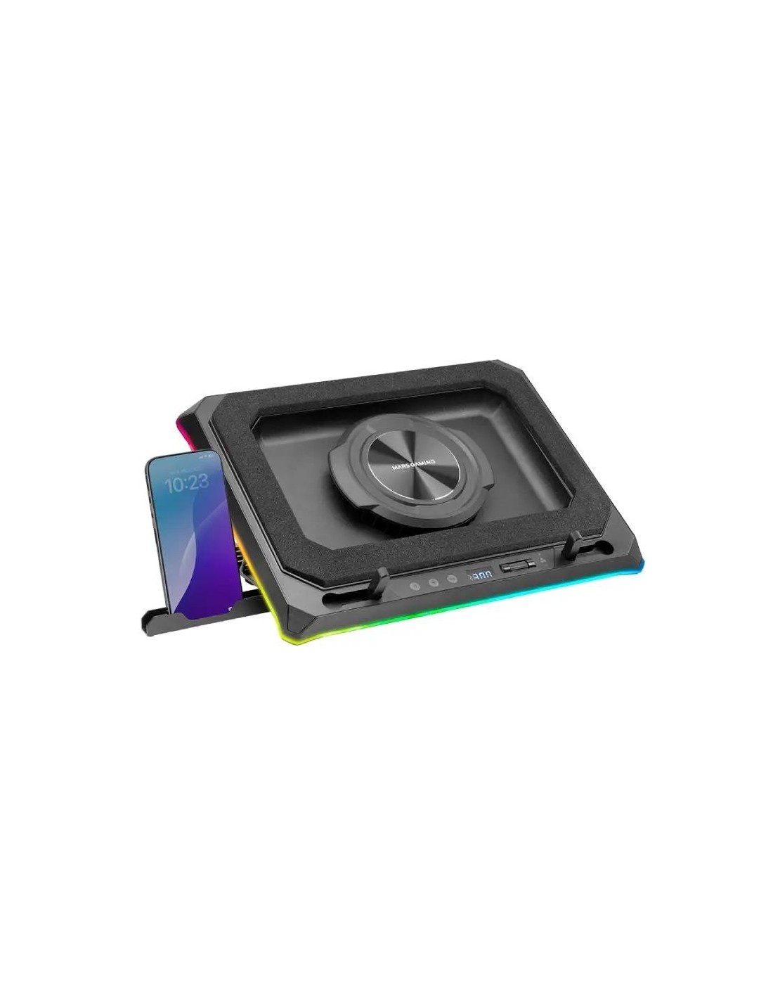 | Características | - Tipo de producto: Base de refrigeración y soporte para portátiles - Conectividad: 4x USB-A 2.0 (salida), 1x USB-C (alimentación para hub USB), 1x conector de alimentación - Ventilador: 1x 140mm con velocidad de hasta 2400 RPM - Iluminación: RGB Chroma personalizable - Materiales: Acero y ABS - Función stand: Altura regulable en 5 posiciones - Extras: Soporte para móviles plegable - Compatible con portátiles de hasta 18" Dimensiones y peso - 420 x 340 x 55 mm - 1495 g |