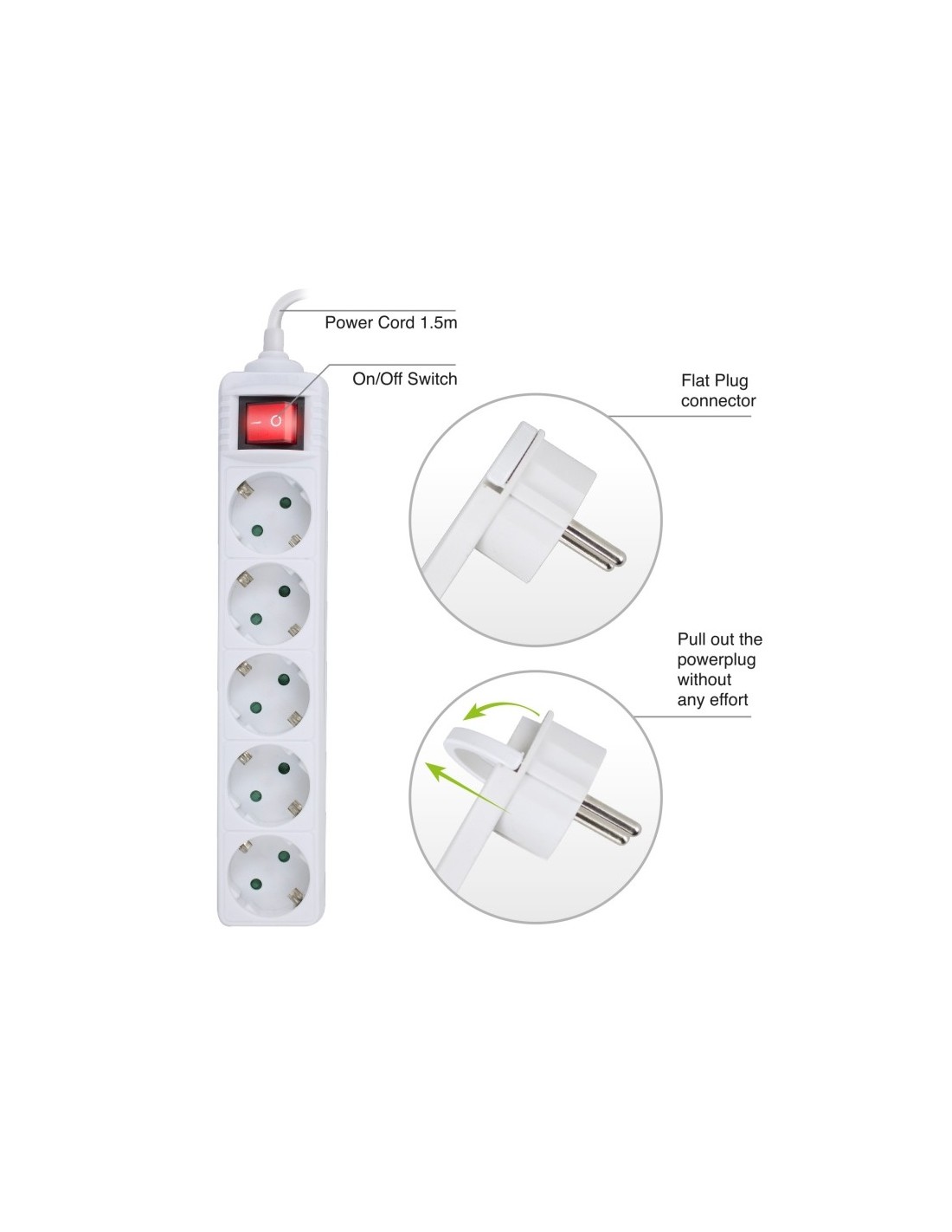 | Caracteristicas | - Salidas: 5 x en ángulo de 45° - Potencia máxima: 16A / 250V - Longitud del cable: 1,5 m con enchufe plano - Espesor del cable: 3 x 1,5 mm² - Protección infantil: si - Interruptor de encendido: 1 x interruptor iluminado |
