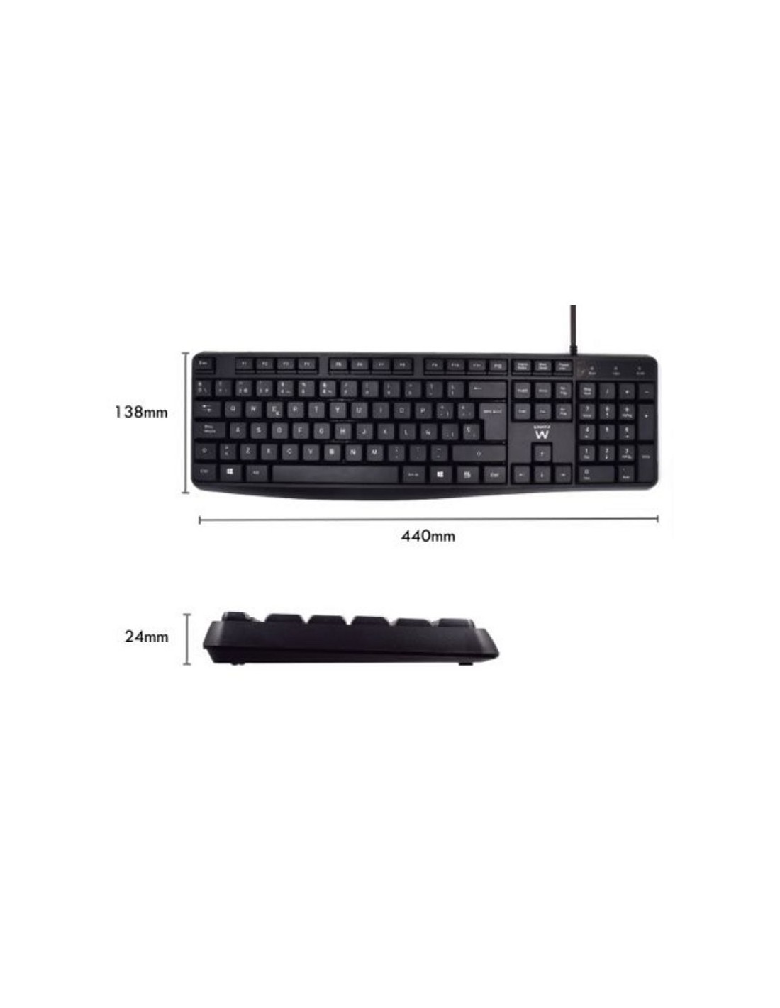 | Características | Teclado - Diseño QWERTY ES - Número de llaves: 104 - Tipo de llave: perfil bajo y silencioso - LED de estado: Numlock, Capslock, Scroll - Longitud del cable: 1,35 m - Dimensión: 440x24x138mm Ratón - Tipo de conexión: USB con cable - Sensor: óptico - DPI: 1000 - Número de botones: 2 + rueda de desplazamiento - Zurdos o diestros: zurdos, diestros - Longitud del cable: 1,35 m - Dimensión: 104x65x37mm |