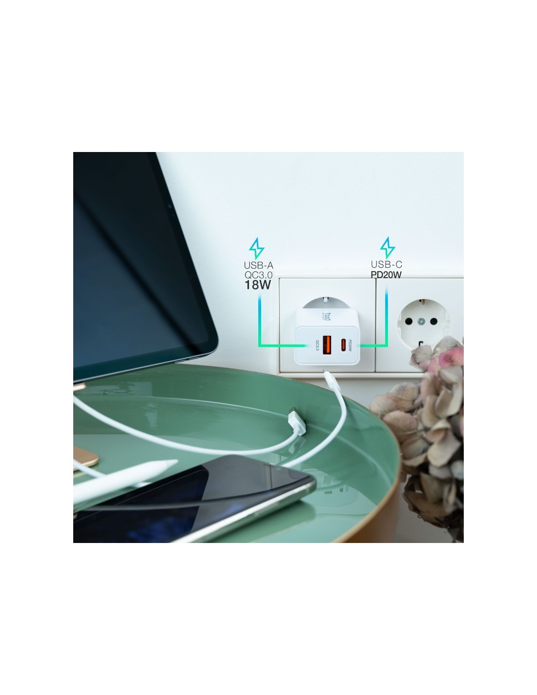 | Características | - Entrada: 100-240V 50/60Hz 0.8A - Salidas USB-C (PD 20W): DC5V/3A, DC9V/2.22A, DC12V/1.67A - Salida USB-A (QC3.0): 18W - Salidas USB-C + USB-A: DC5V 3A total - Potencia total: 20W - Certificación: CE y RoHS - Color: Blanco - Peso: 49 gr - Medidas del producto: 81 x 41 x 17 mm |