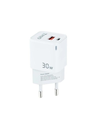 | Características | - La fabricación con GaN (Nitruro de Galio): Suministro de corriente más eficiente disminuyendo las altas temperaturas que soportan los dispositivos. Esta tecnología proporciona la ventaja de poder reducir el tamaño de los cargadores. - Entrada: 100-240V 50/60Hz 0.8A - Salidas: - Salida USB-C (PD): 5V/3A 9V/3A 15V/2A 20V/1.5A - Salida USB-A (QC): 5V/3A 9V/2A 12V/2.25A - Salidas USB-C+USB-C: 5V/3A - Potencia total: 30W - Certificación: EMC, LVD, ROHS Y ERP6 - Color: Blanco - Peso neto: 0,052 kg. Peso bruto: 0.068 kg - Medidas del producto: 33 x 28 x 70 mm |