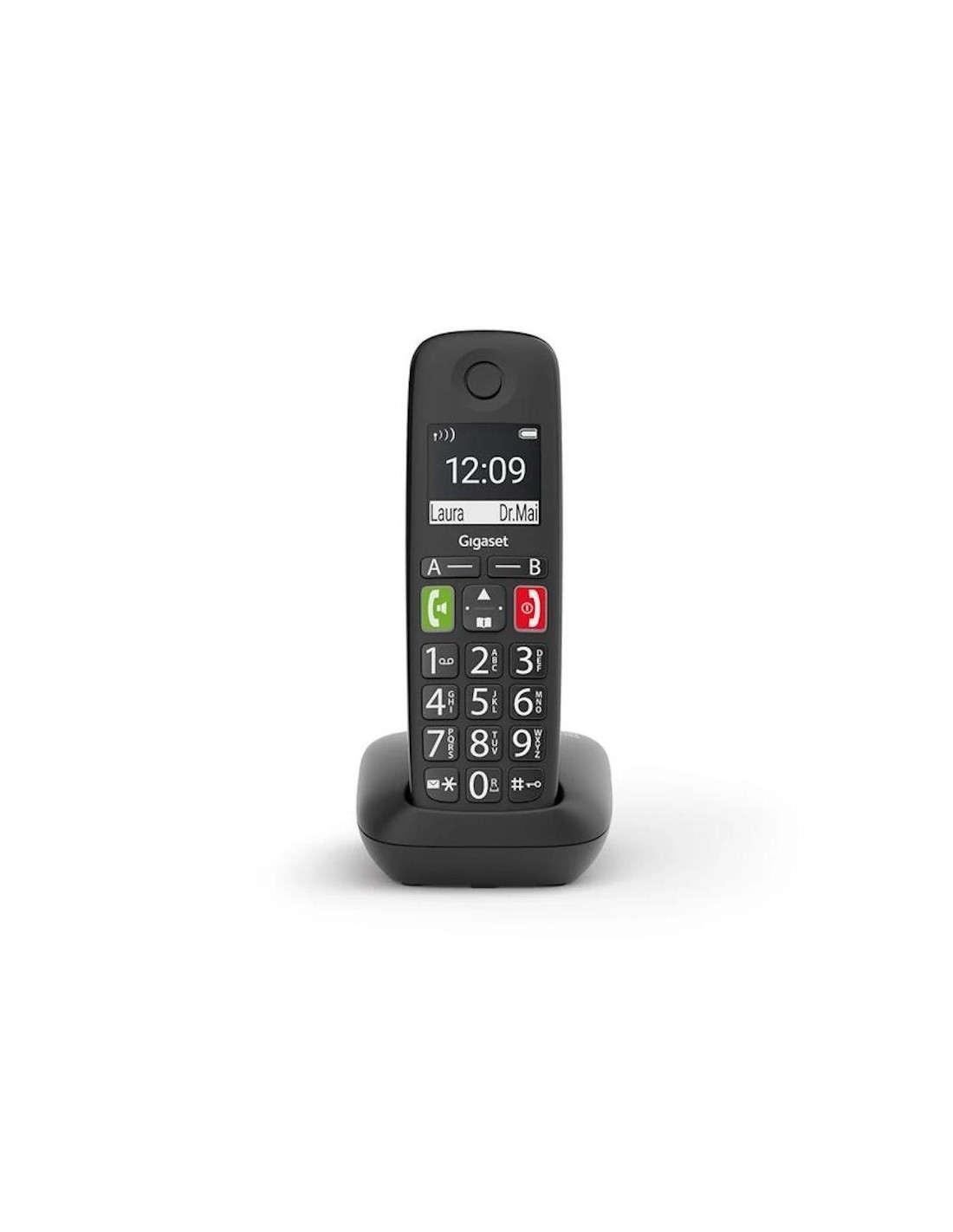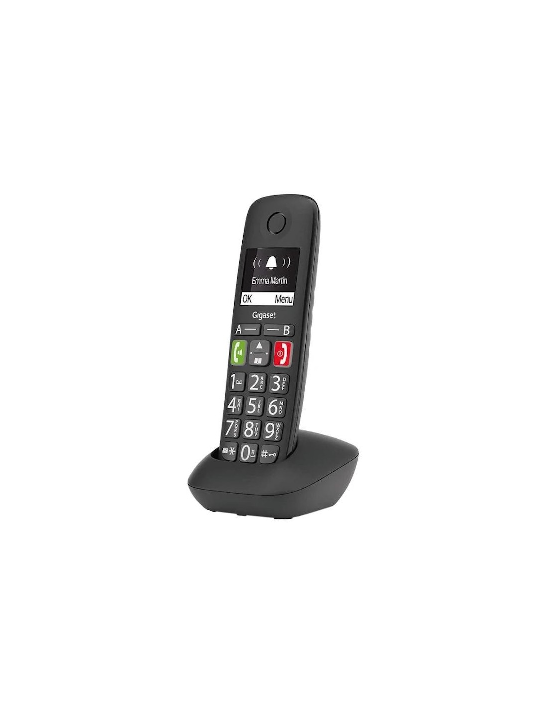 Si el simple hecho de marcar un número de teléfono es sencillo, el resto de la experiencia telefónica será mucho más agradable. Esta es exactamente la razón por la cual el teclado ergonómico del teléfono de teclas grandes Gigaset E290 ahora hace que usar el teléfono sea lo más cómodo posible. Las teclas grandes están iluminadas y claramente etiquetadas para garantizar una buena legibilidad. Puede guardar contactos particularmente importantes, como personas para llamar en caso de emergencia, en una de las dos teclas de repertorio (A y B). La función de llamada directa es útil si solo desea poder llamar a un número desde el teléfono. En situaciones difíciles, puede presionar cualquier botón y se marcará el número que haya almacenado.