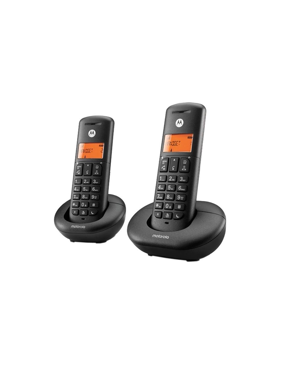 El Motorola E2, un terminal elegante y de fácil uso. Tiene una pantalla blanca y negra que cuando se enciende brilla de color ambar, incorpora todas las características principales de los teléfonos inalámbricos modernos. Ofrece bloqueo de llamadas, hasta 10 números específicos. También dispone del modo "no molestar" para cuando no se desea recibir llamadas ni mensajes ni recibir alerta ni por timbre ni por luz.