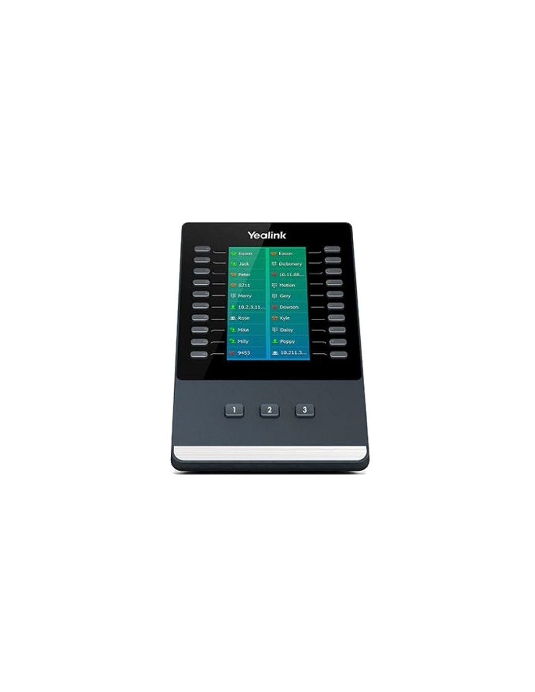 El módulo de expansión Yealink EXP50 con pantalla a color para los teléfonos IP de la serie Yealink T5, incluidos SIP-T58V/ SIP-T58A/ SIP-T56A/ SIP-T54S/ SIP-T52S, está diseñado para ampliar la capacidad funcional de su teléfono SIP a un nivel completamente nuevo. Cuenta con una gran pantalla LCD a color de 4.3 pulgadas, que garantiza una experiencia visual única. Además, le proporciona una interfaz de usuario simple y capacidades avanzadas de manejo de llamadas. Por ejemplo, tres páginas de 20 botones que se muestran en la pantalla pueden programarse hasta 60 funciones diferentes.